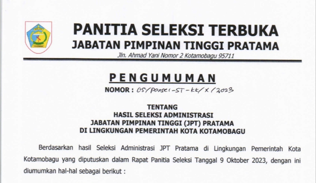 LIPUTANBMR.COM, KOTAMOBAGU– Sebanyak 41 peserta dinyatakan lulus tahapan administrasi dalam seleksi terbuka (Selter) Jabatan Pimpinan …