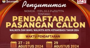 LIPUTANBMR.COM,KOTAMOBAGU – Komisi Pemilihan Umum (KPU) Kota Kotamobagu resmi umumkan jadwal pendaftaran bakal pasangan calon …