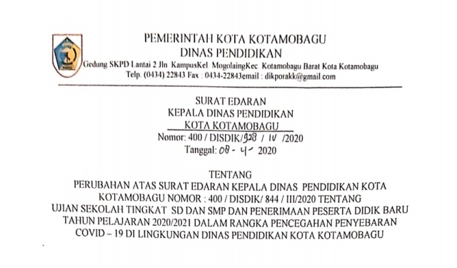 Selengkapnya »Disdik Kotamobagu Keluarkan Edaran Terkait Ujian Sekolah Tingkat SD dan SMP Serta PSBB, Dalam Masa Pandemi Covid-19