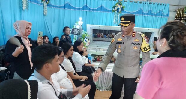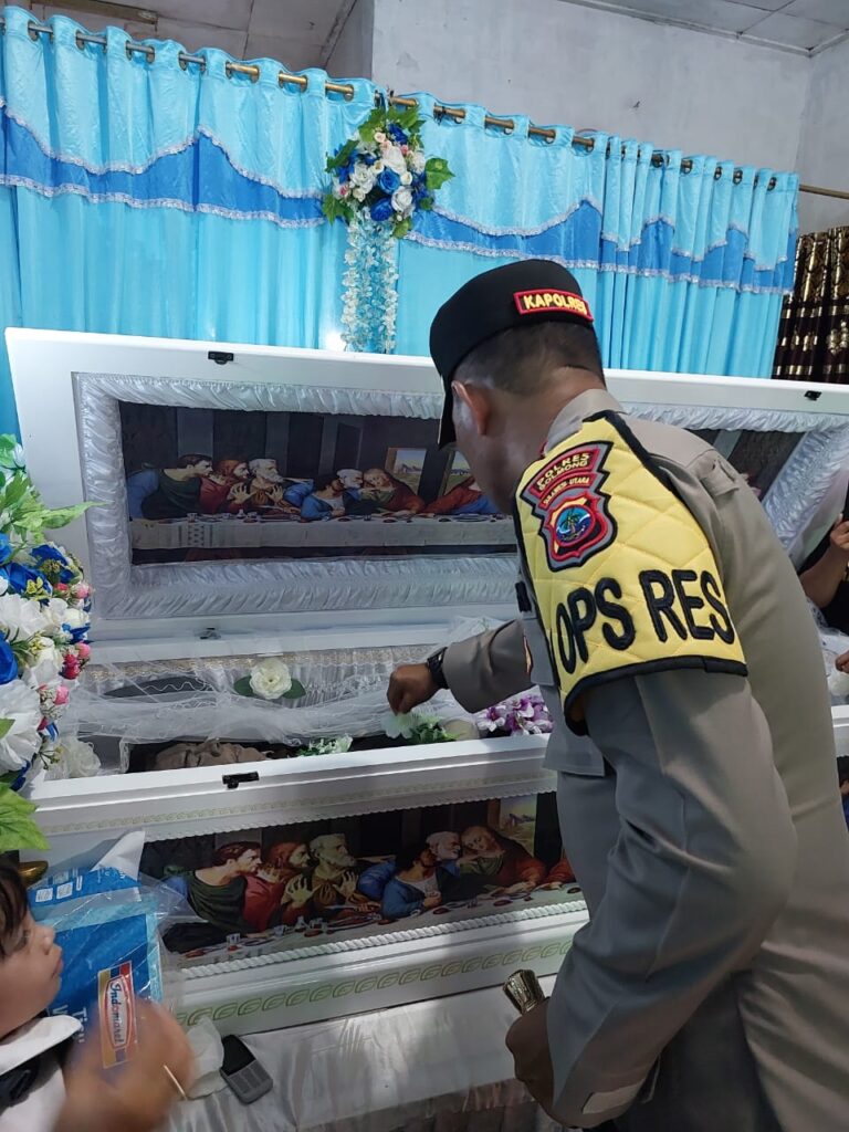 Kapolres Bolmong, AKBP Arianto Salkery, SH, MH, didampingi Ketua Cabang Bhayangkari Bolmong, Ny. Viska Indra, SH., MKn, beserta personel dan anggota Bhayangkari Bolmong, mengunjungi rumah duka di Desa Inobonto, Kecamatan Bolaang Sabtu siang, 15 Juli 2023.