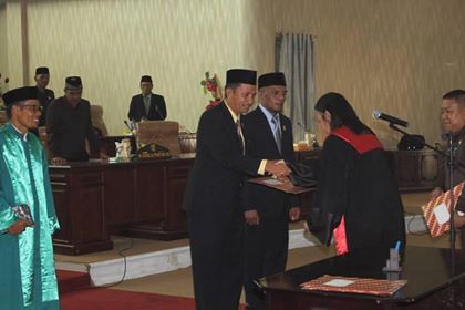 LiputanBMR.com, Bolmut – Dewan Perwakilan Rakyat Daerah (DPRD) Kabupaten Bolaang Mongondow Utara (Bolmut) menggelar sidang paripurna dalam rangka pengambilan sumpa janji Dua pimpinan DPRD dalam sisa masa jabatan periode 2014-2019, di gedung DPRD Bokmut Selasa (3/7/2018).