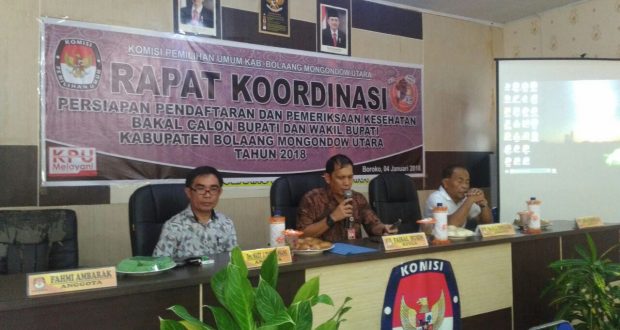 LiputanBMR.com, Bolmut – Komisi Pemilihan Umum Daerah Kabupaten Bolaang Mongondow Utara, (KPUD Bolmut) menggelar Rapat Kordinasi (Rakor) tahapan pendaftaran dan pemeriksaan kesehatan bakal Calon Bupati dan Wakil Bupati Bolmong Utara periode 2018-2023.