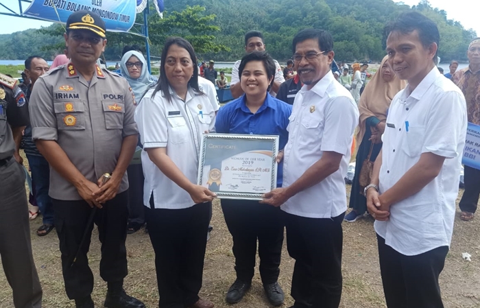 Bupati saat penyerahan bantuan didampingi Kepala Dinas Kelautan dan Perikanan Dr. Erna Mokodongan, SPi, MSi, Ketua DPD KNPI Boltim Amalia Landjar, Polres serta Pimpinan Satuan Kerja Perangkat Daerah (SKPD).