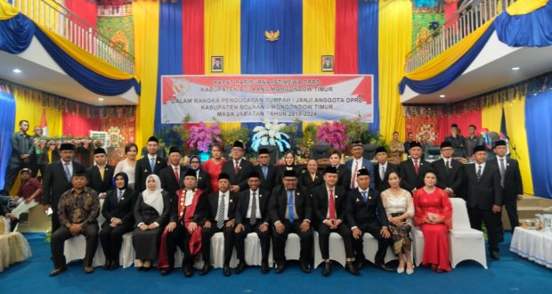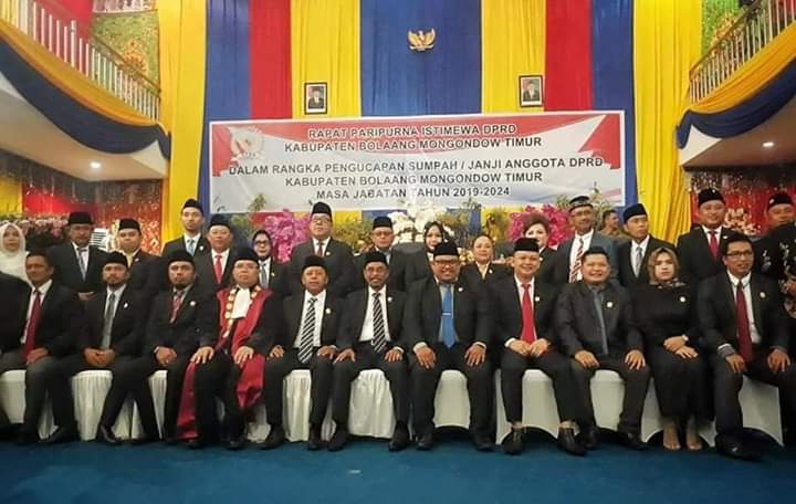 Paripurna Istimewah yang sebelumnya dipimpin Ketua DPRD Boltim, Drs Marsaoleh Mamonto, secara resmi membuka dan menutup masa jabatan Anggota DPRD periode 2014 – 2019 lewat penyampaian Sekertaris Dewan (Sekwan) Priyamos SH, membacakan Surat Keputusan Gubernur No. 329 tahun 2019 tentang Peresmian dan pemberhentian anggota DPRD masa jabatan tahun 2014 s.d 2019 dan pengucapan sumpah dan janji 20 anggota DPRD tahun 2019 s.d 2024.