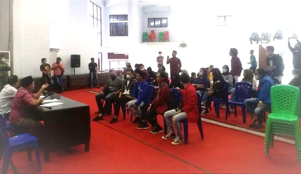 Para Mahasiswa diterima wakil rakyat di ruang paripurna gedung DPRD Kotamobagu, Kamis 4 April 2022. Adapun tuntutan yang disuarakan terkait stabilisasi kenaikan harga bahan pokok, bahan bakar minyak (BBM) dan Pajak Pertambahan Nilai (PPN).