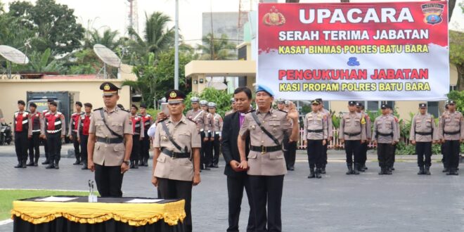 BATU BARA, LIPUTANBMR.com – Kapolres Batubara AKBP TAUFIK HIDAYAT TAYEB, S.H.,S.I.K., pimpin serah terima jabatan (sertijab) Kasat Binmas dan Pengukuhan Kasi Propam Polres Bara bertempat di Lapangan apel Polres Batubara, Senin (23/9/2024).