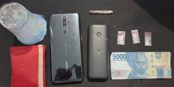 “Adapun barang bukti yang diamankan 3 Buah Plastik Klip Berukuran Kecil yg berisikan Narkotika Shabu, brutto 0,51 gram. 1 Pipa Kaca / Pirex bekas pakai brutto 1,31 Gram. 1 Dompet kecil warna merah tempat menyimpan narkotika shabu, 1 buah alat hisap / bong terbuat dari gelas air mineral. 1 Unit Handphone Android Merk Oppo Warna Hitam. 1 Unit Handphone Merk Nokia Warna Hitam dan Uang Tunai Rp. 50.000,