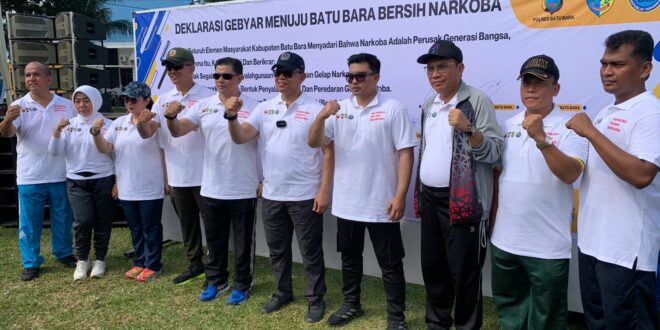 BATUBARA, LIPUTANBMR – Ribuan masyarakat bersama Forkopimda Batu Bara kompak mendeklarasikan perang dengan Narkoba pada acara Gebyar Batu Bara Bersih Narkoba. Kegiatan itu digelar di Lapangan Bola Kaki, Kelurahan Lima Puluh, Kecamatan Lima Puluh, Kabupaten Batu Bara, Kamis (6/6/2024).