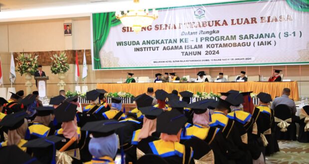 LIPUTANBMR.COM,KOTAMOBAGU- Penjabat Wali Kota Kotamobagu, Asripan Nani, menghadiri Sidang Senat Terbuka Luar Biasa dalam rangka Wisuda Angkatan I Program Sarjana Institut Agama Islam Kotamobagu (IAIK) bertempat di Ballroom Hotel Sutanraja Kotamobagu, Kamis (25/1/2024).