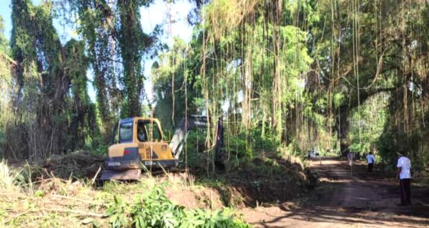 Pantauan di lokasi kompleks eks rudis Bupati Bolmong, personil dari Dinas PUPR dan DLH bersama perangkat Kelurahan Kotobangon, saat ini tengah melakukan pemebersihan area bangunan termasuk akses jalan.