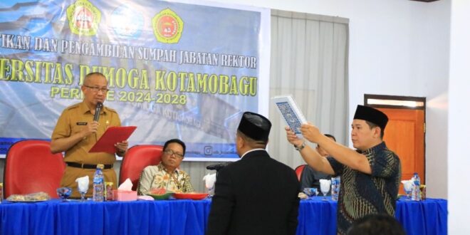 LIPUTANBMR.COM,KOTAMOBAGU – Penjabat (Pj) Wali Kota Dr. Drs. Hi. Asripan Nani., M.Si resmi melantik Dr. Muharto., S.Pd.I., S.E., M.Si., sebagai Rektor Universitas Dumoga Kotamobagu Masa Bakti 2024-2028.