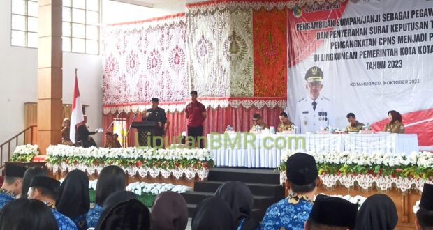 SK 100 persen PNS tersebut diserahkan langsung Pj Wali Kota Kotamobagu Dr. Drs. Asripan Nani M.Si, yang sekaligus memimpin prosesi pengambilan sumpah janji PNS di lingkup Pemkot Kotamobagu, Senin (9/10/2023).