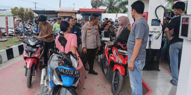 Kapolsek Medang Deras Bersama Personil Tetap Siaga Satu Kawal SPBU Antrian Panjang
