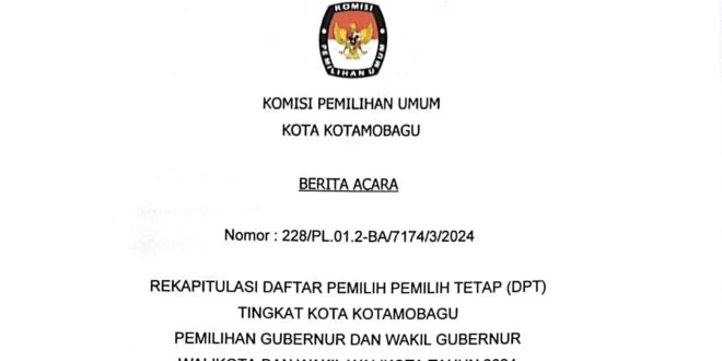 LIPUTANBMR.COM,KOTAMOBAGU– Komisi Pemilihan Umum (KPU) Kota Kotamobagu telah melaksanakan Rapat Pleno Terbuka Rekapitulasi Daftar Pemilih Tetap (DPT) Tingkat Kota Kotamobagu untuk pemilihan kepala daerah (Pilkada) serentak tahun 2024.