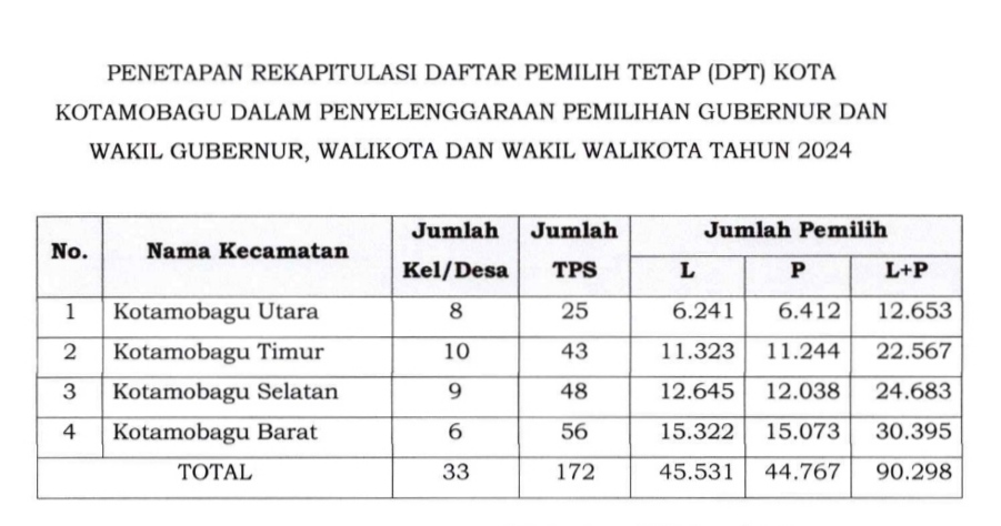 Adapun Rincian Rekapitulasi Daftar Pemilih Tetap (DPT) tertuang dalam SK Nomor 225 tahun 2024 tentang Penetapan Rekapitulasi Daftar Pemilih Tetap (DPT) Kota Kotamobagu yang ditandatangani Ketua KPU Kota Kotamobagu Mishart Ajinulah Manoppo tertanggal 20 September 2024.