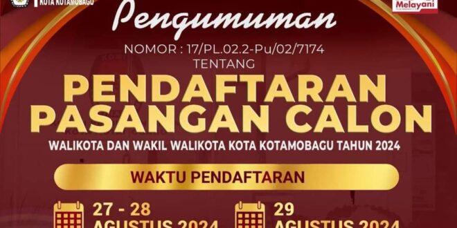 LIPUTANBMR.COM,KOTAMOBAGU – Komisi Pemilihan Umum (KPU) Kota Kotamobagu resmi umumkan jadwal pendaftaran bakal pasangan calon (Bapaslon) dalam Pemilihan Kepala Daerah (Pilkada) serentak tahun 2024.