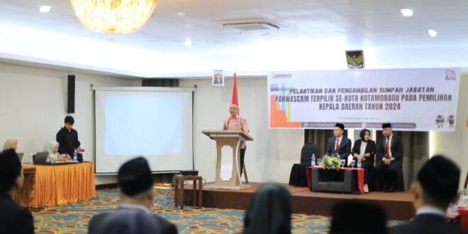 LIPUTANBMR.COM,KOTAMOBAGU – Penjabat (Pj) Wali Kota Kotamobagu, Asripan Nani, menghadiri pelantikan Panitia Pengawas Pemilu Kecamatan (Panwascam) terpilih pada Pemilihan Kepala Daerah (Pilkada) Kota Kotamobagu tahun 2024, di Hotel Sutanraja Kotamobagu, Jumat (25/5/2024).