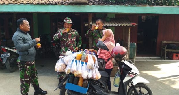 Sertu M. Rifai anggota Koramil 19/Gabus yang tergabung dalam Satgas TMMD Kodim Pati, saat berangkat kerja menyelesaikan pembangunan rumah tidak layak huni [RTLH] di Desa Godo Kecamatan Winong, setiap pagi selalu minum jamu yang jual Kusmitri (34) warga RT 06 RW 01 Dukuh Jetak Desa Angkatan Lor Kecamatan Tambakromo.