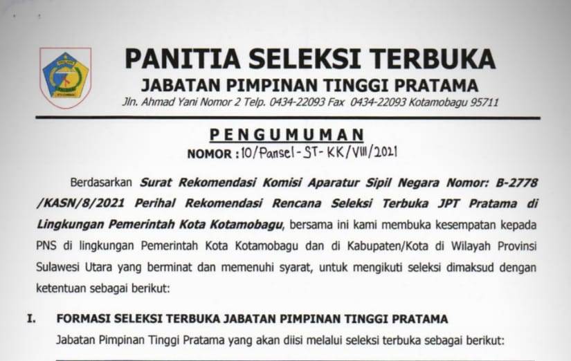 Selengkapnya »Kembali Dibuka, Berikut Persyaratan Seleksi JPT Pratama Lingkup Pemkot Kotamobagu
